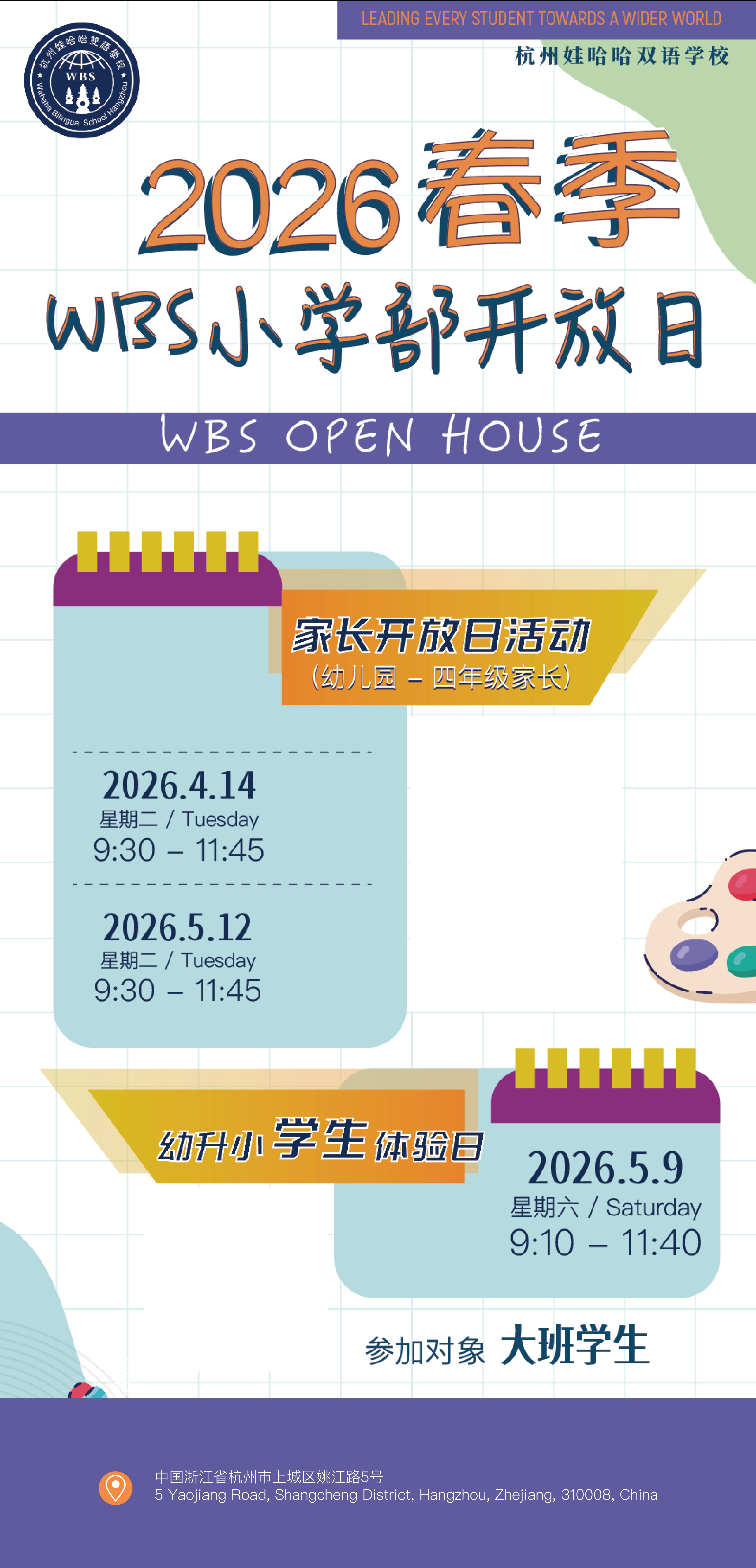 杭州娃哈哈双语学校(Wahaha Bilingual School Hangzhou)成立于2014年,位于杭州市钱江新城核心地块,是一所十二年制的纯民办双语学校。这是一所生根于杭州丰沃的文化土壤,将中国智慧带给世界的学校。学校已经形成了一套以国家九年义务制教育教学大纲为基础,强化21世纪人才所需的核心素养为目标的双语课程体系。学校秉承中国传统教育之精髓,博采世界多元文化之精华,通过中英文浸润式教学,使我们的学生带着对中国文化的自信走向未来世界的国际舞台。