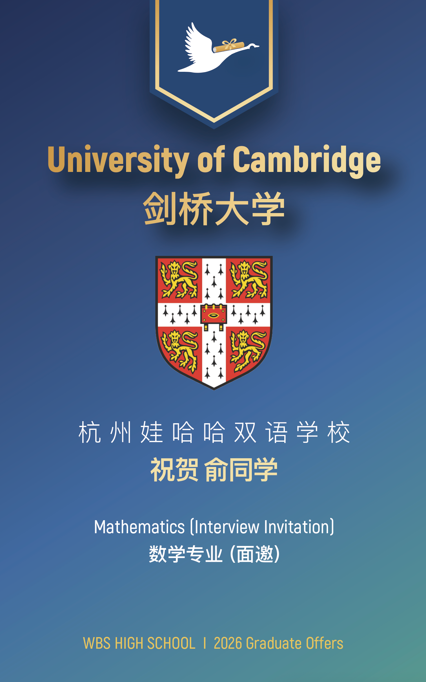 连年获得剑桥大学面邀!祝贺杭州娃哈哈双语学校高中部的优秀学子!